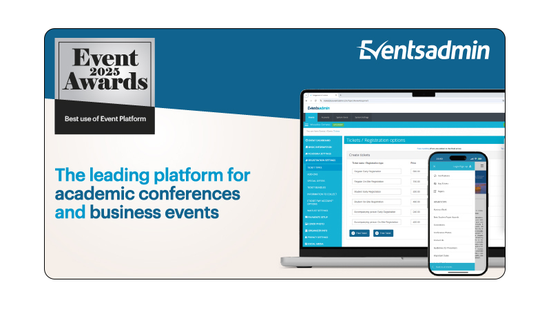 Η πλατφόρμα διαχείρισης συνεδρίων EventsAdmin απέσπασε μια σημαντική διάκριση, κερδίζοντας το Silver Award στην κατηγορία Best Use of Event Platform στα Event Awards 2025. Η τελετή απονομής πραγματοποιήθηκε την Παρασκευή 24 Ιανουαρίου 2025, στο InterContinental Athenaeum Athens, αναδεικνύοντας κορυφαίες λύσεις και καινοτομίες στον κλάδο των εκδηλώσεων.